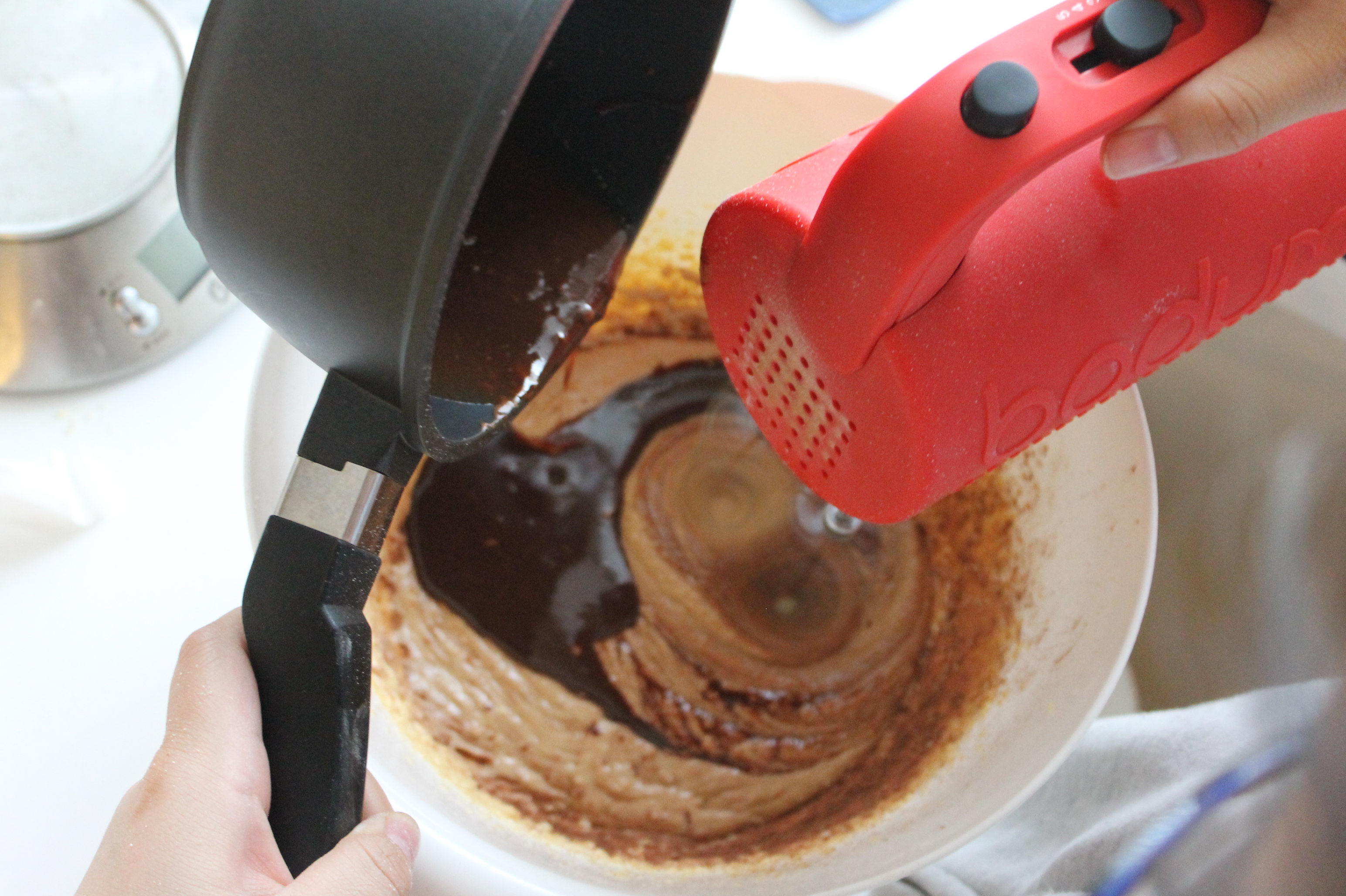 3. TILSETT SMELTET SMØR OG SJOKOLADE