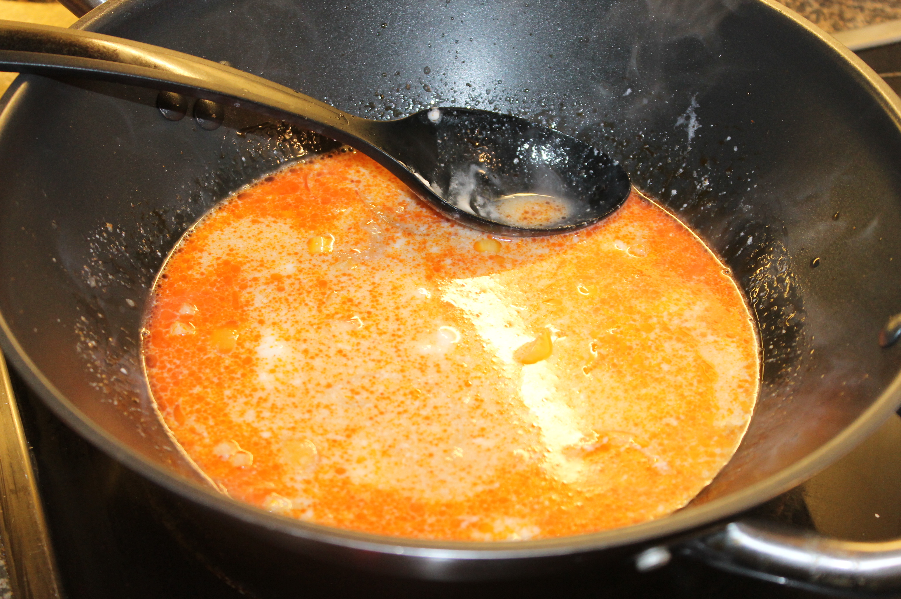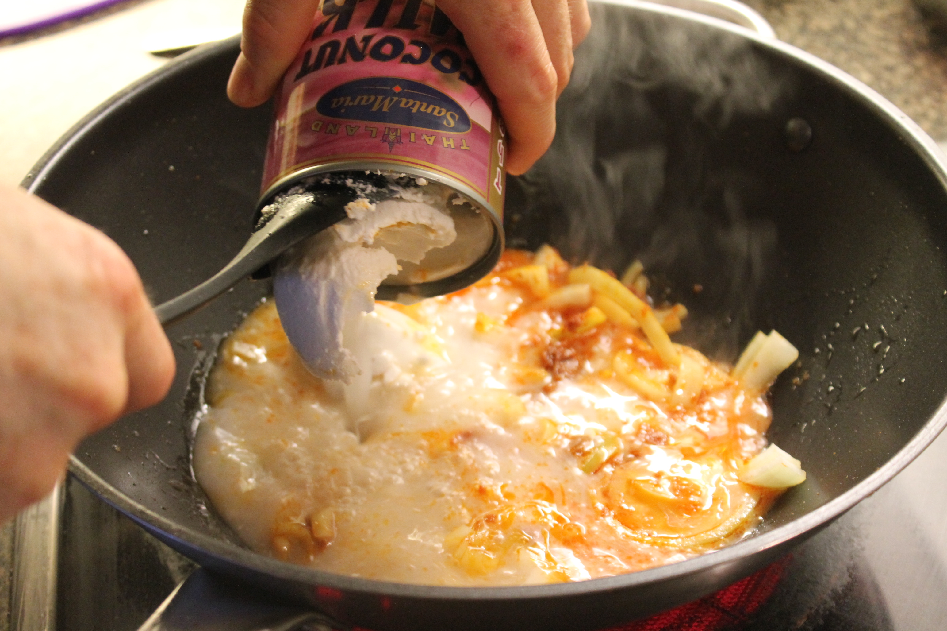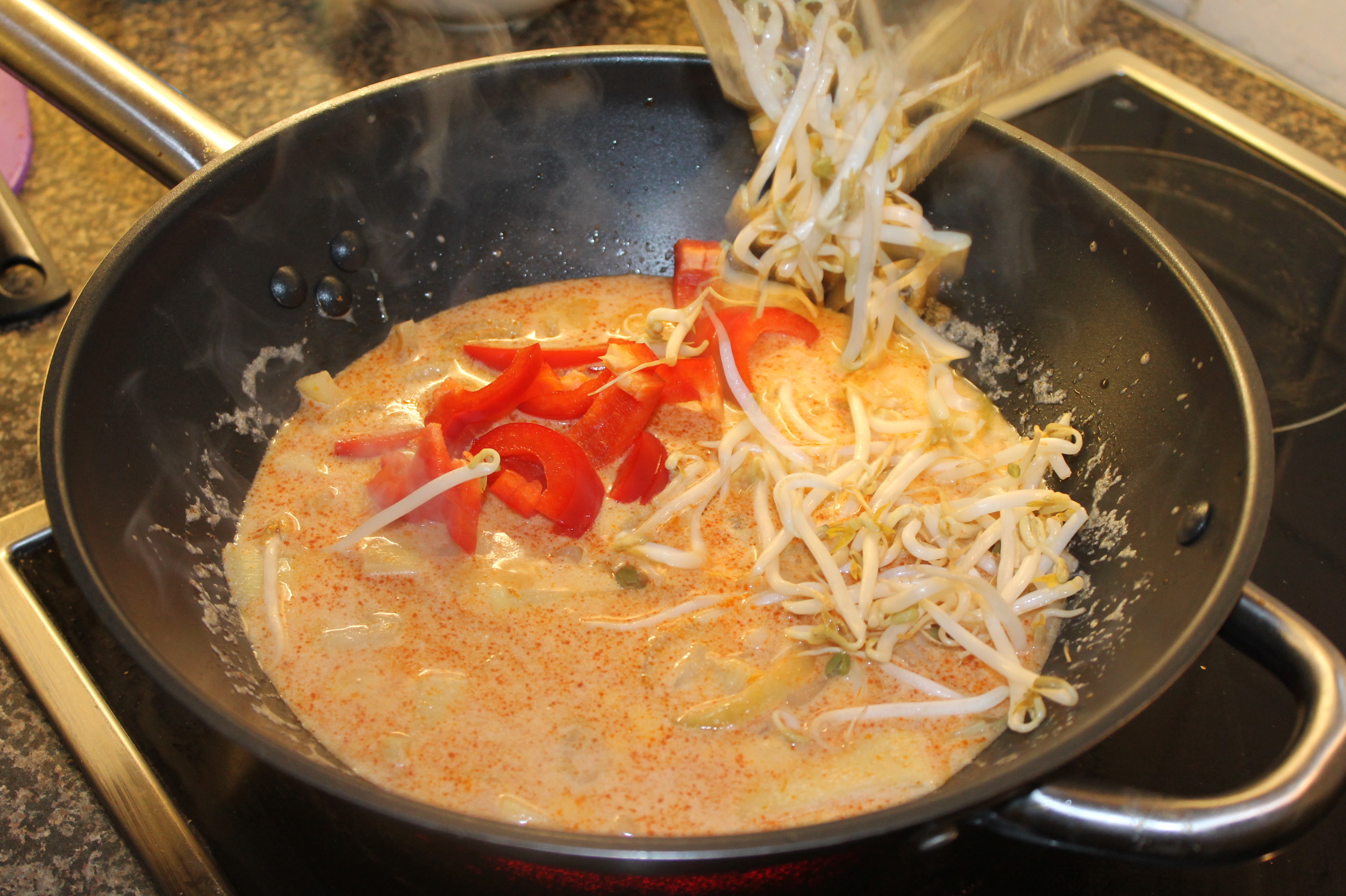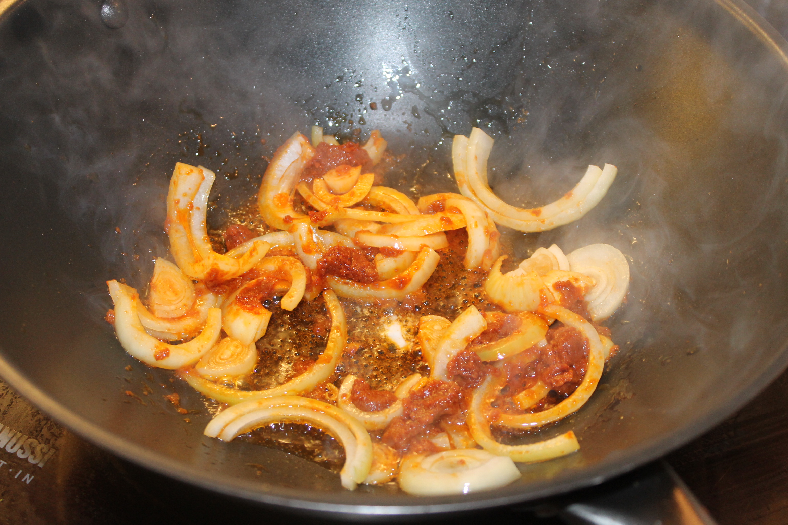 1. Ha olje i pannen. Når det blir varmt sleng oppi ferdig strimlet løk (ikke for tynne skiver). Putt deretter oppi curry pasten og stek dette i ca 2 minutter.