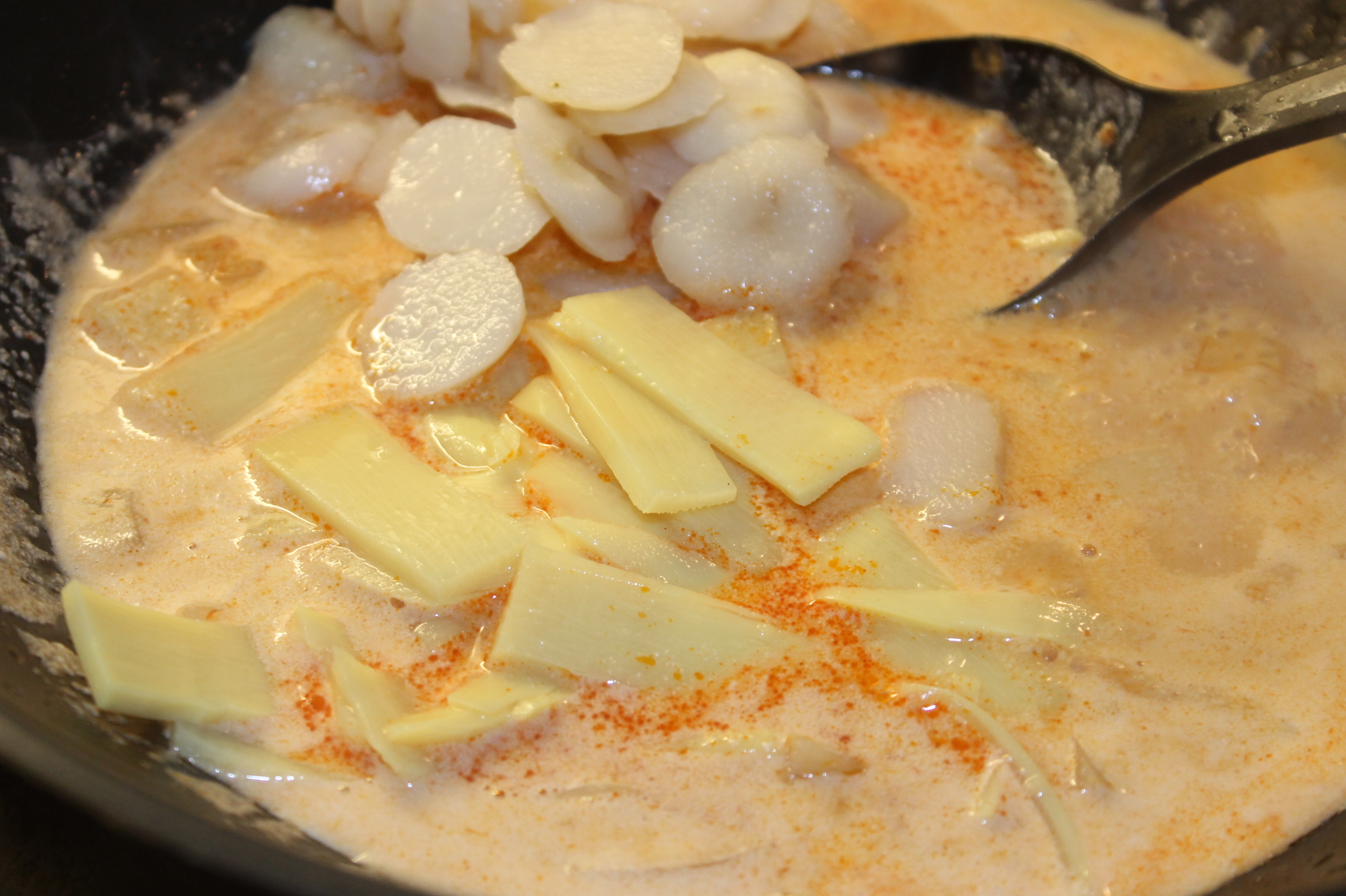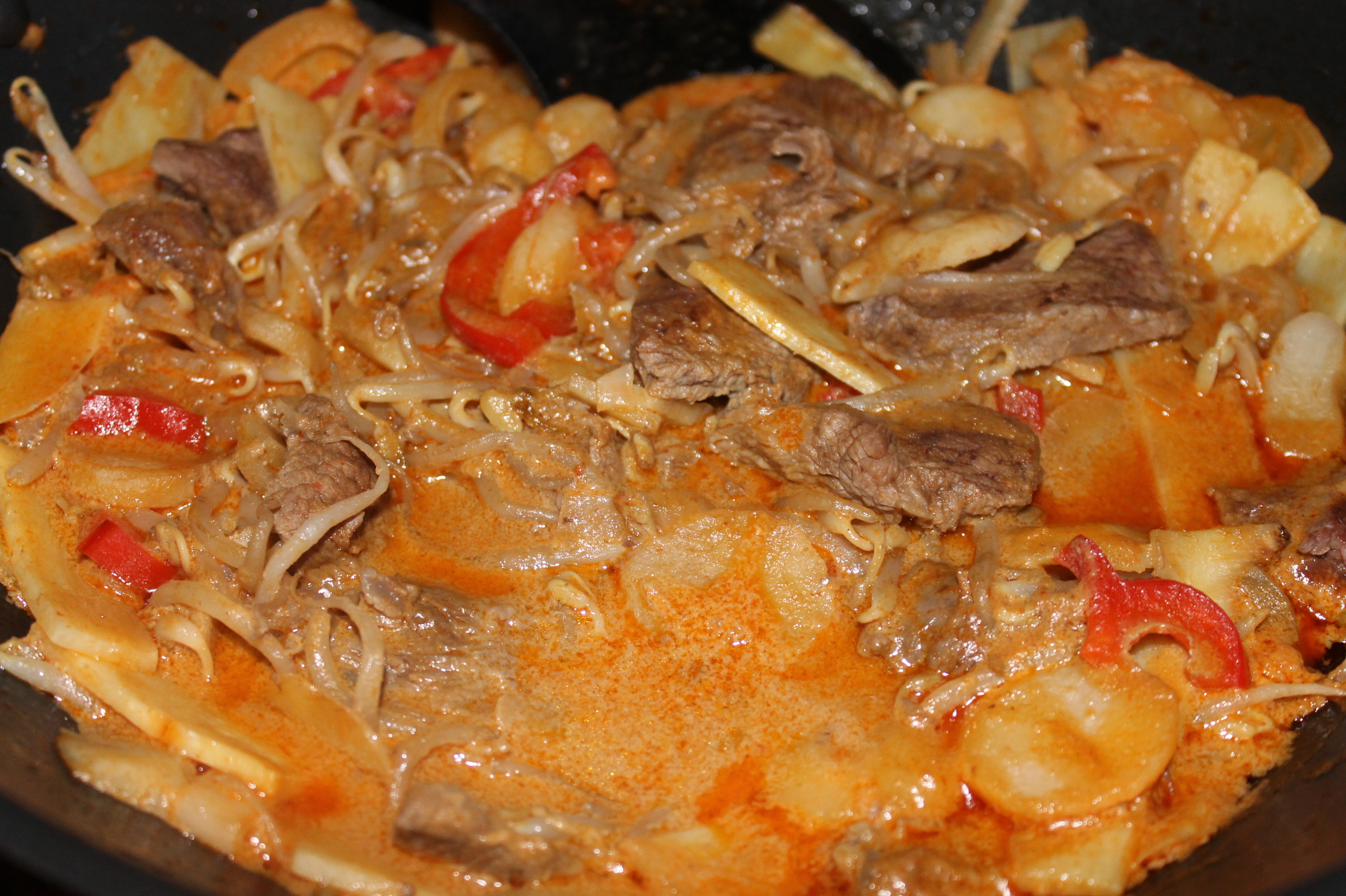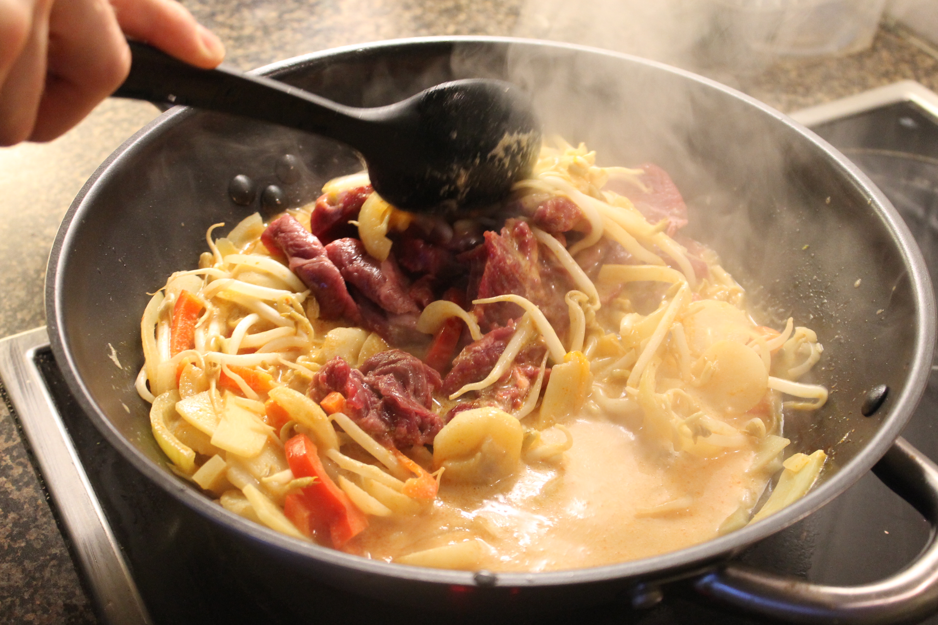 3. Når du har rørt ut kokosmelken til den er fri for klumper, tilsett alle grønnsakene og til slutt kjøttet. Så skal curryen stå å koke på middels varme i 20-30 min