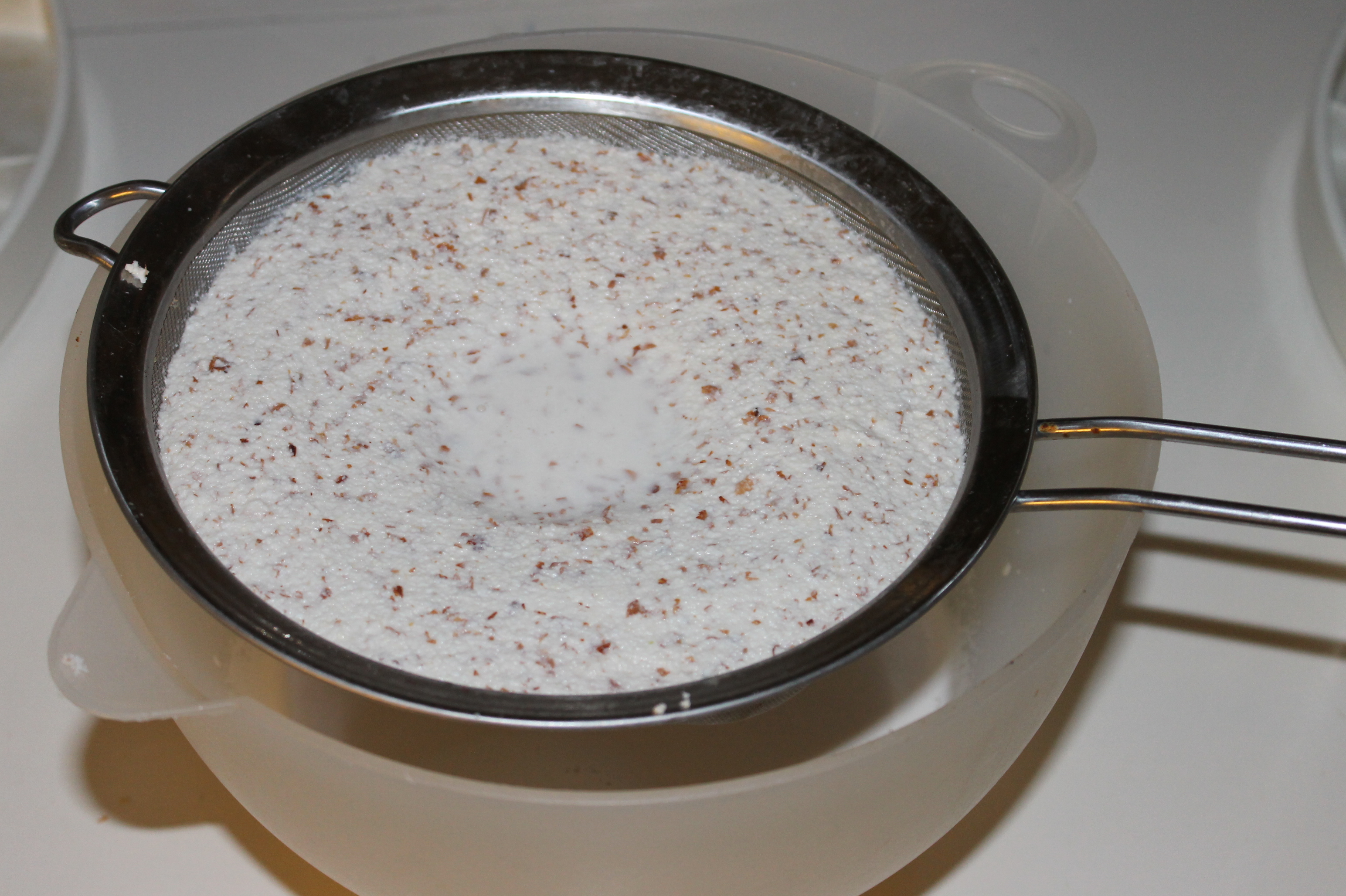 Ha en bolle under silen og hell melka igjennom slik at restene av mandlene fanges opp og melka havner i bollen. Restene fra mandlene skal du bruke til å lage mel.