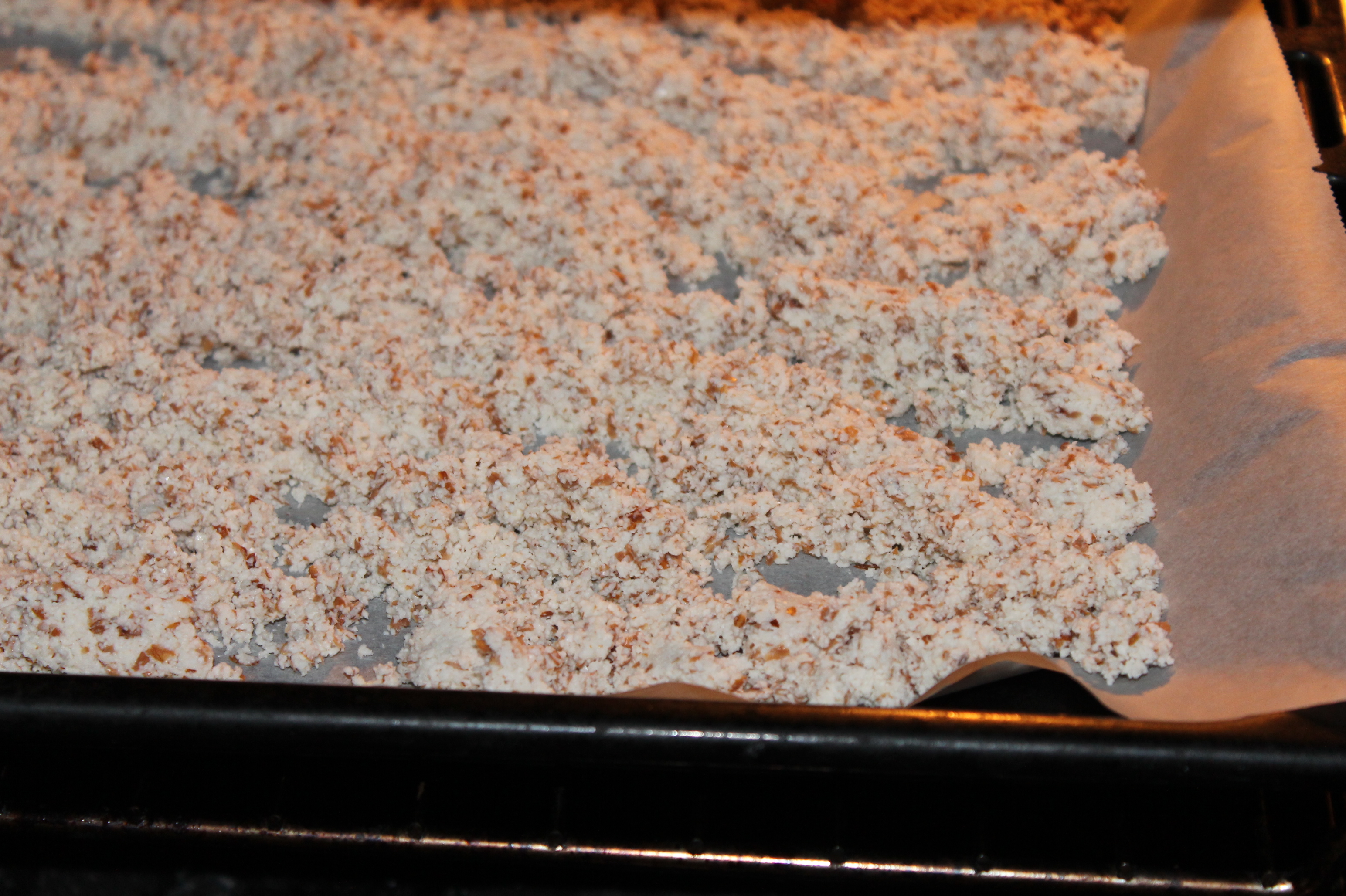 Ta restene fra mandlene og legg det utover ett stekebrett med bakepapir på.