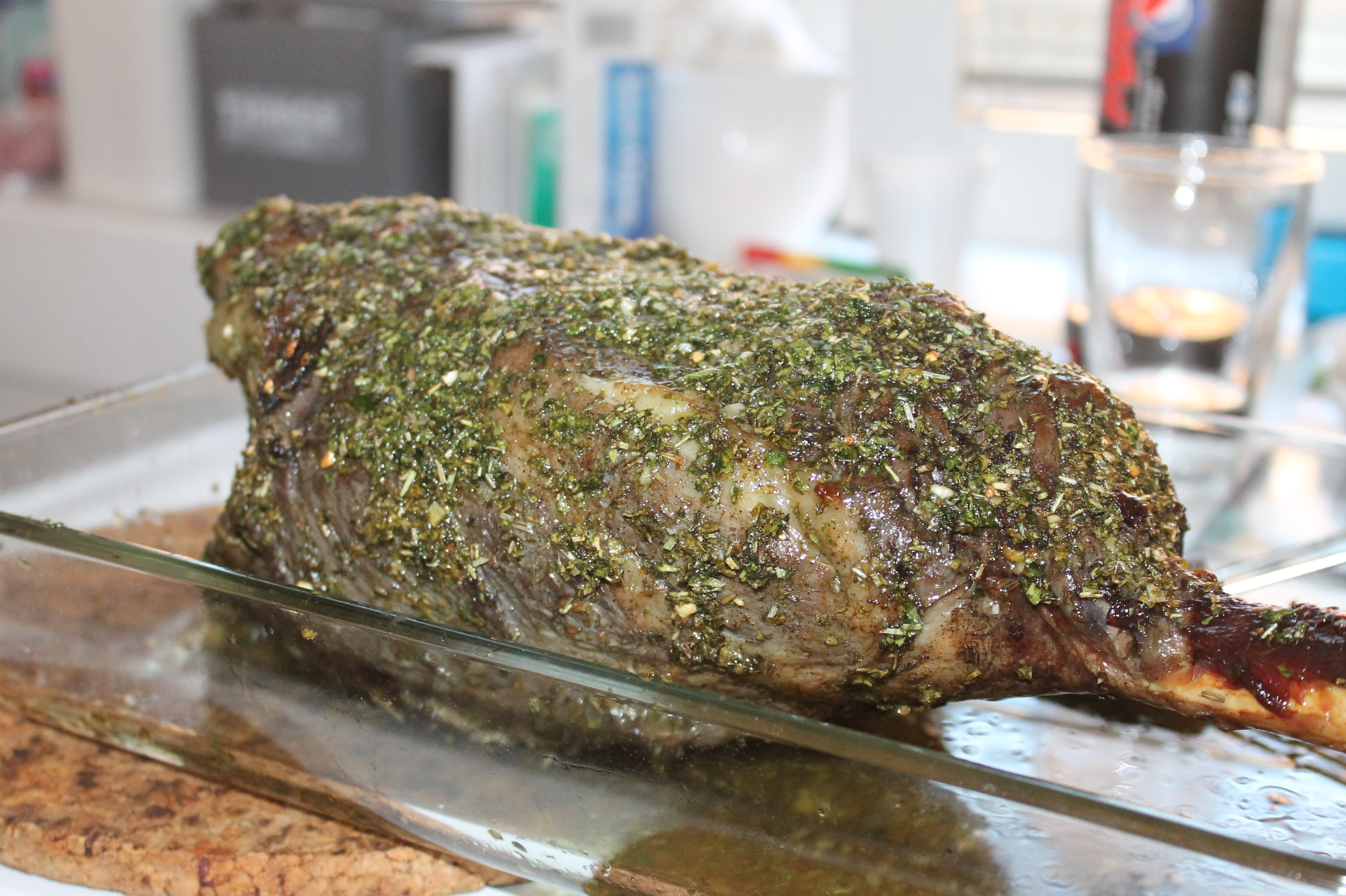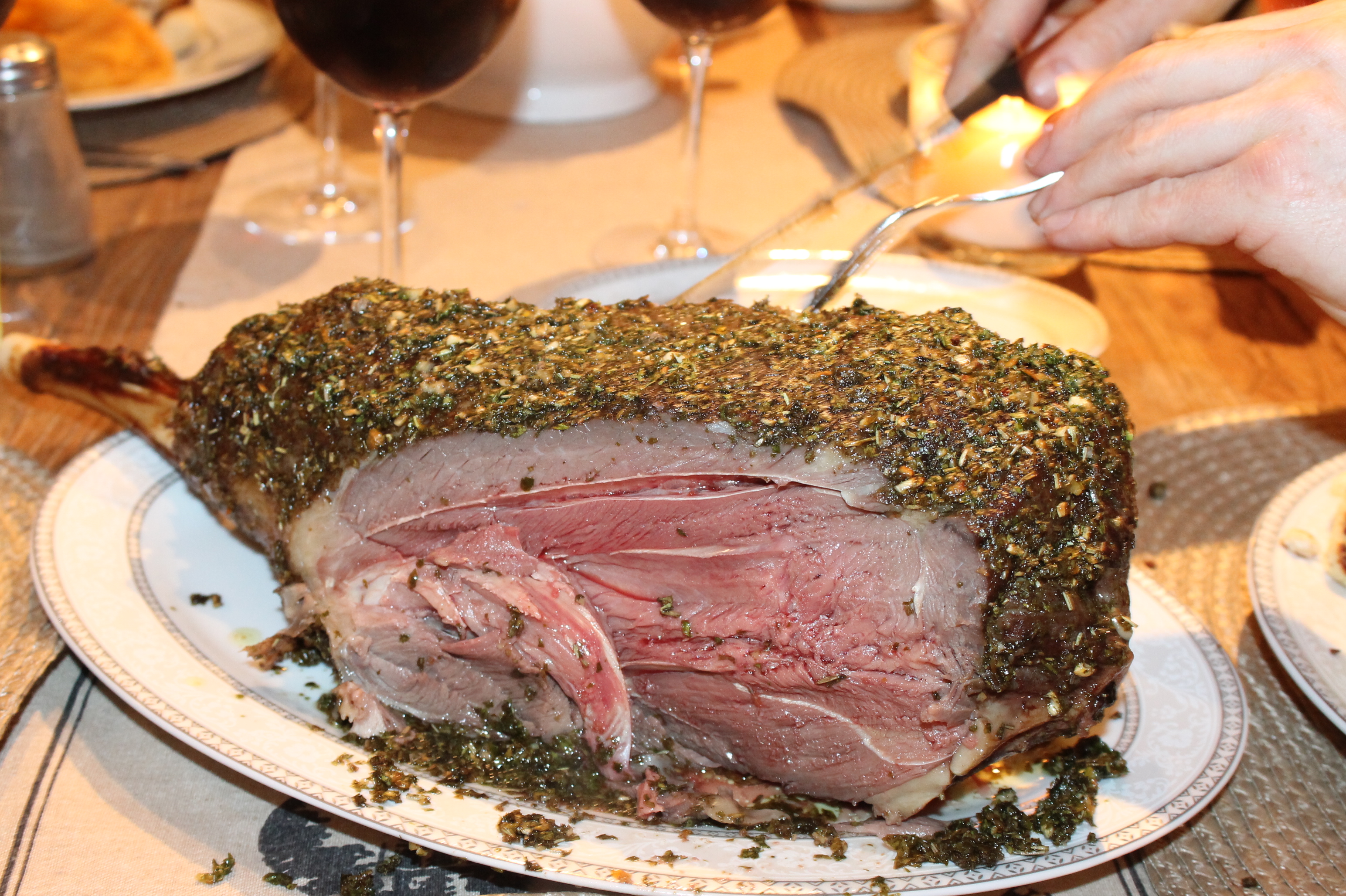 Stek låret til en kjernetemperatur på 58°C, hvis du ønsker låret gjennomstekt så kan det stå til 68°C. Ta det ut og pensle for siste gang med urteblandingen. Deretter lar du den stå på et lunt sted i ca 20 min før det skjæres opp.