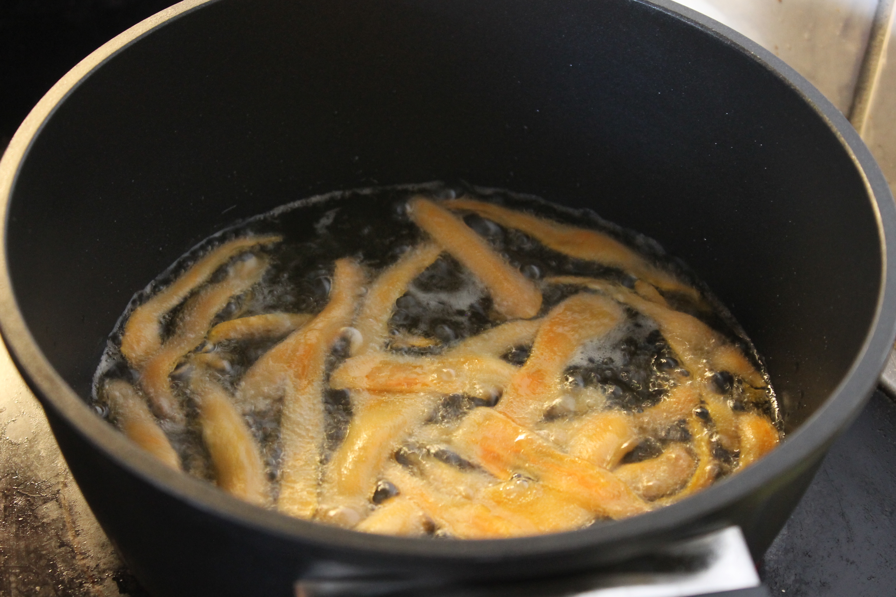 Ha oljen oppi en gryte og sett den på høy varme (viktig at det er høy varme ellers blir chipsen vassen) evt. bruk en frityrkoker om du har det.