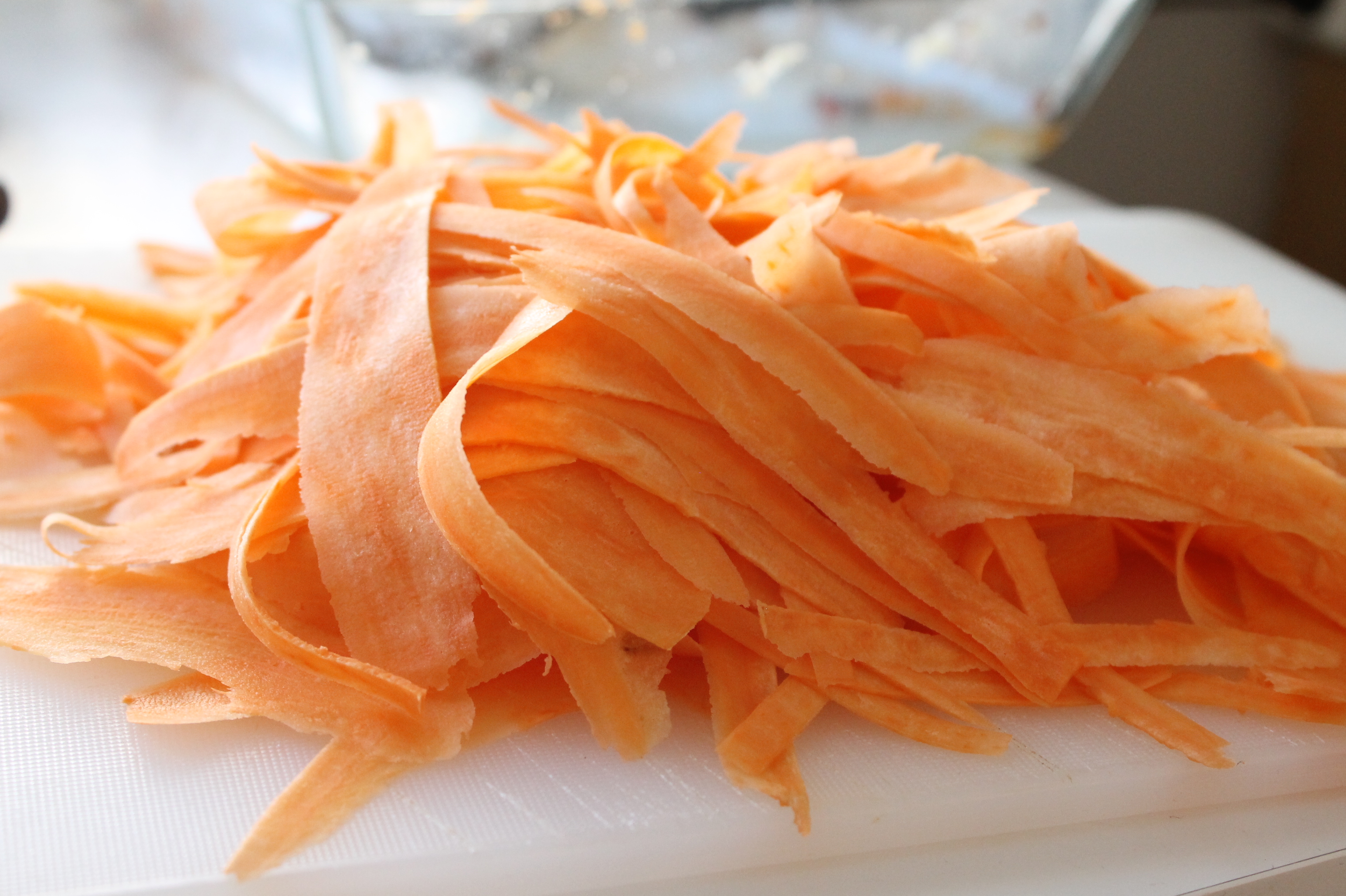 Det er virkelig ikke noe hokkus-pokkus med denne oppskriften. Du fjerner skallet på søtpoteten, og deretter fortsetter du med skrelleren og lager tynne skiver.