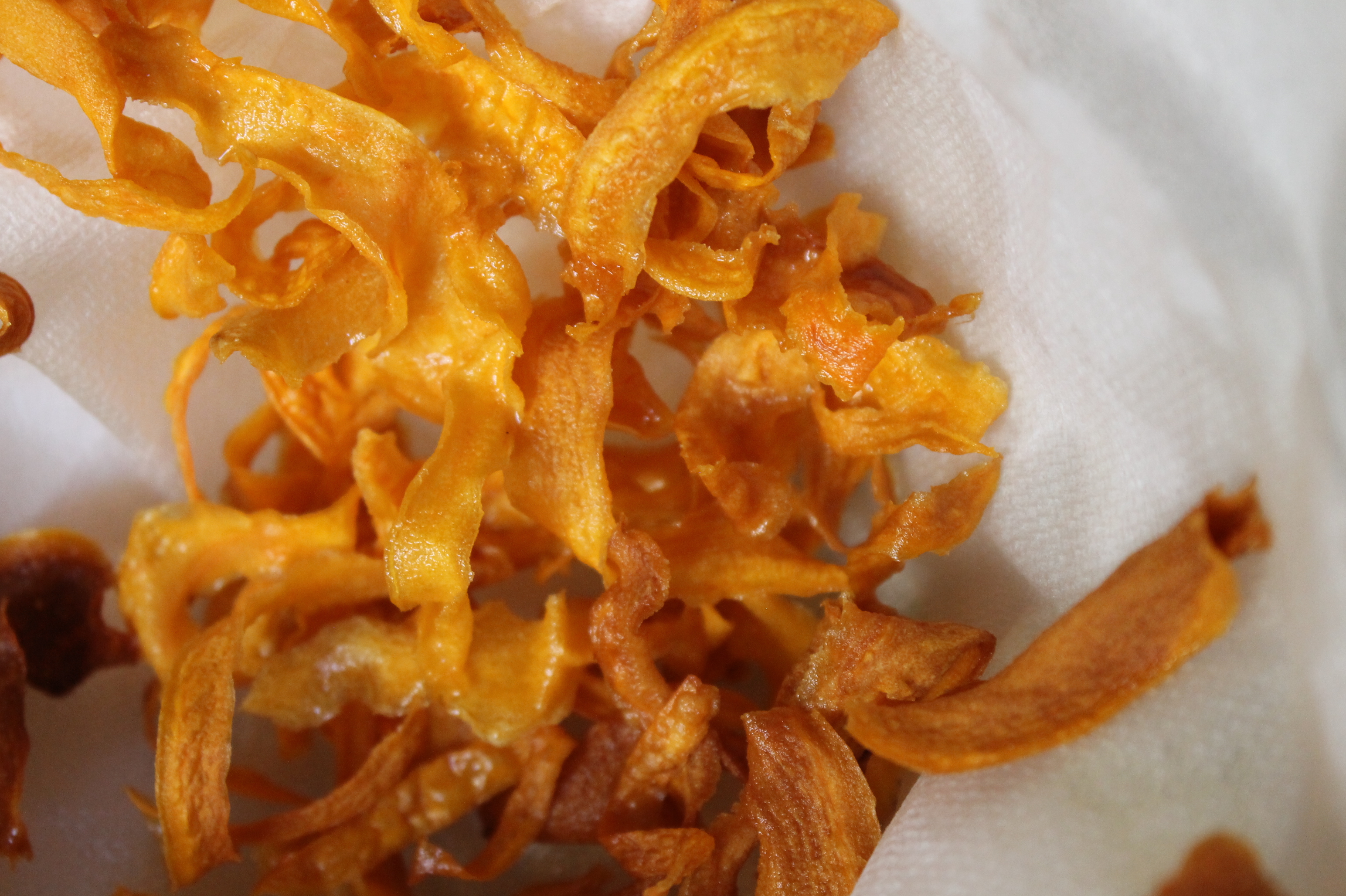 Når du ser at flakene er blitt litt mindre og ser gyllen ut, ta dem opp og legg dem på noe papir som absorberer oljen lett. Her i hjemmet bruker vi Torky men noe litt tykke servietter funker bra, til og med avispapir kan brukes. Vi synes de smakte litt søtt uten salt så vi saltet (veldig) lett, etter det ble det perfekt.