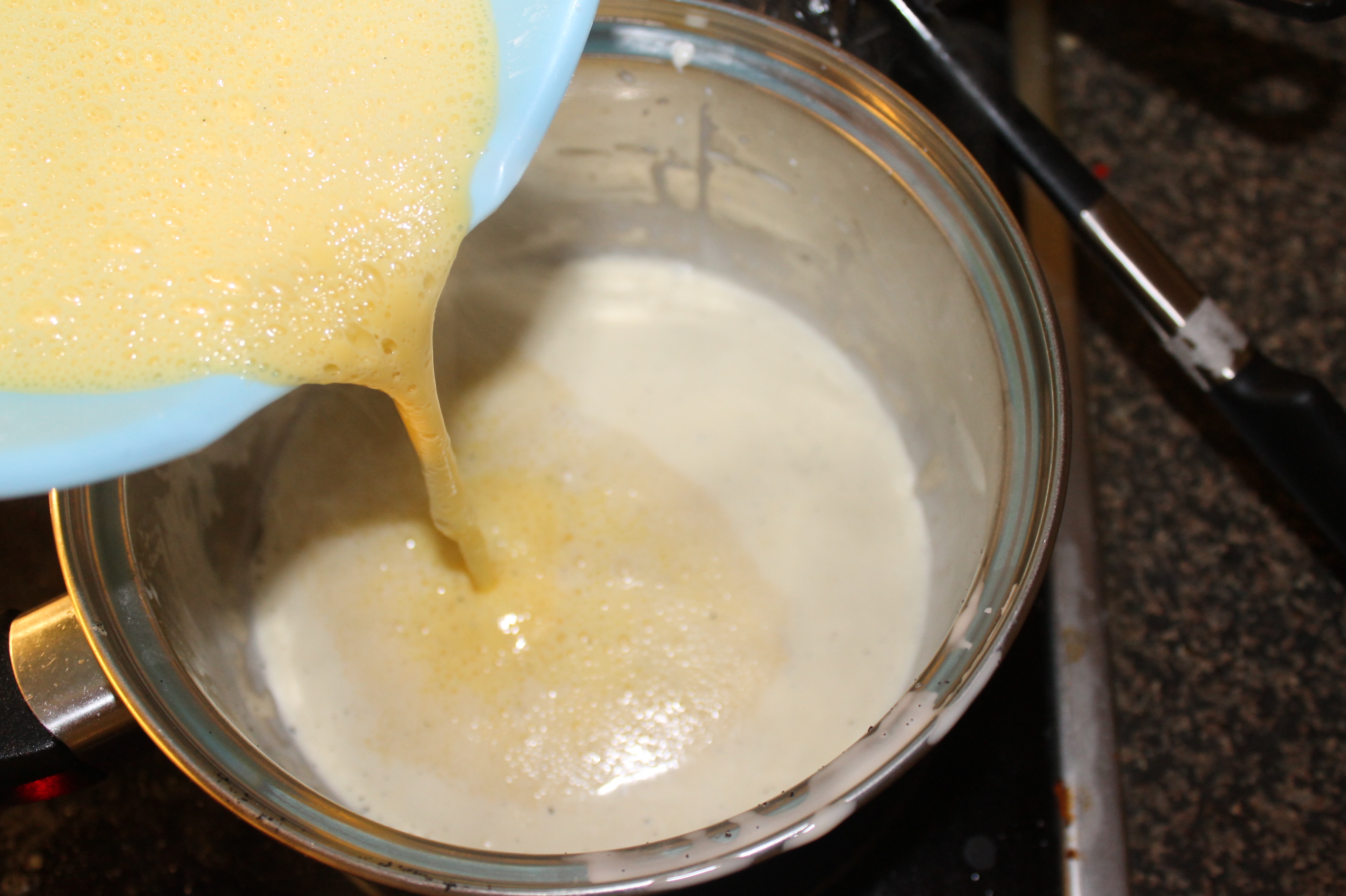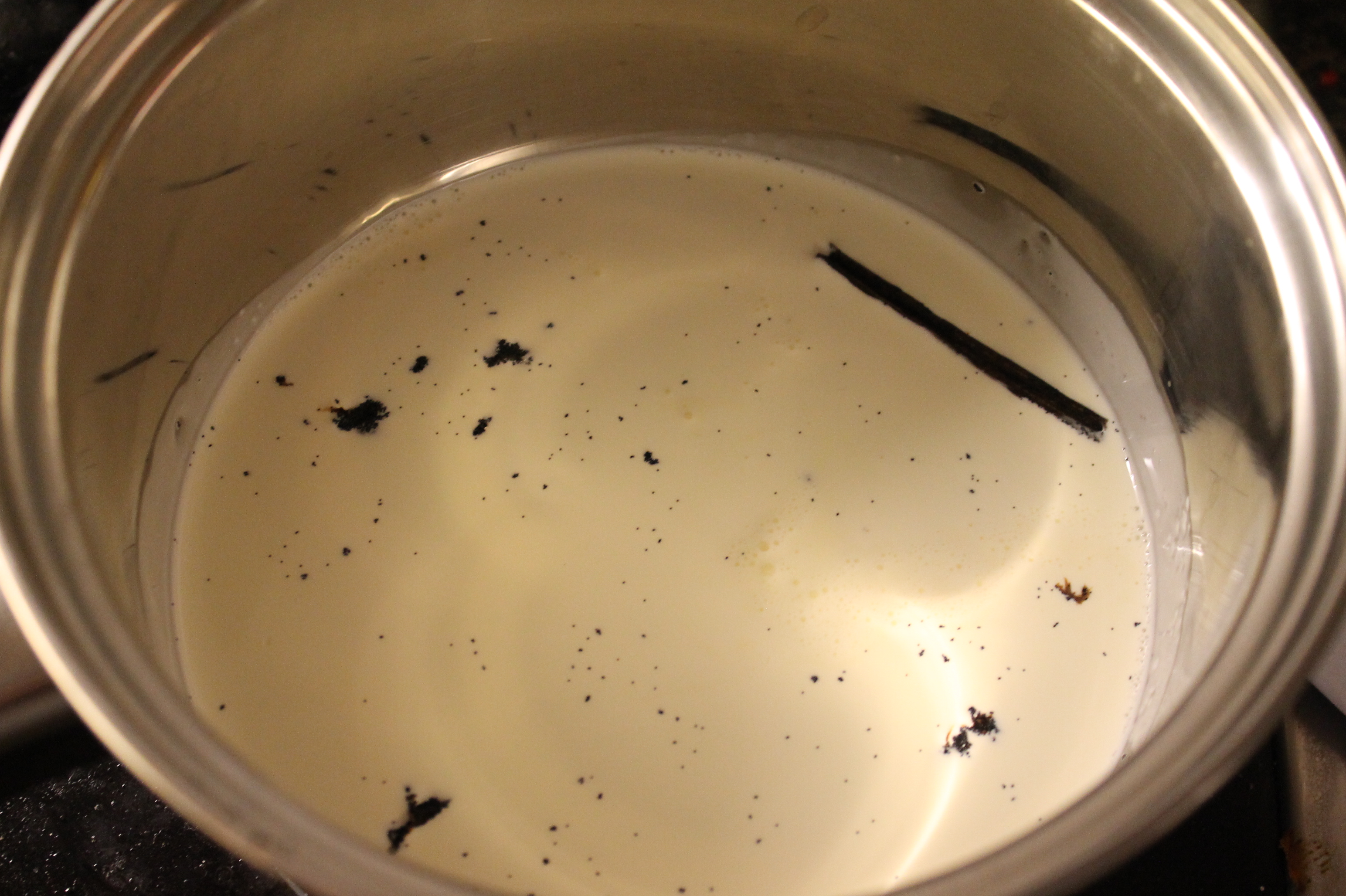 2. Hell melk/fløten i en kjele og kok opp, splitt vaniljestangen og skrap ut frøene, ha det oppi kjelen mens du koker opp. Jeg pleier å hive opp i stengene også -da blir det mer vaniljesmak.