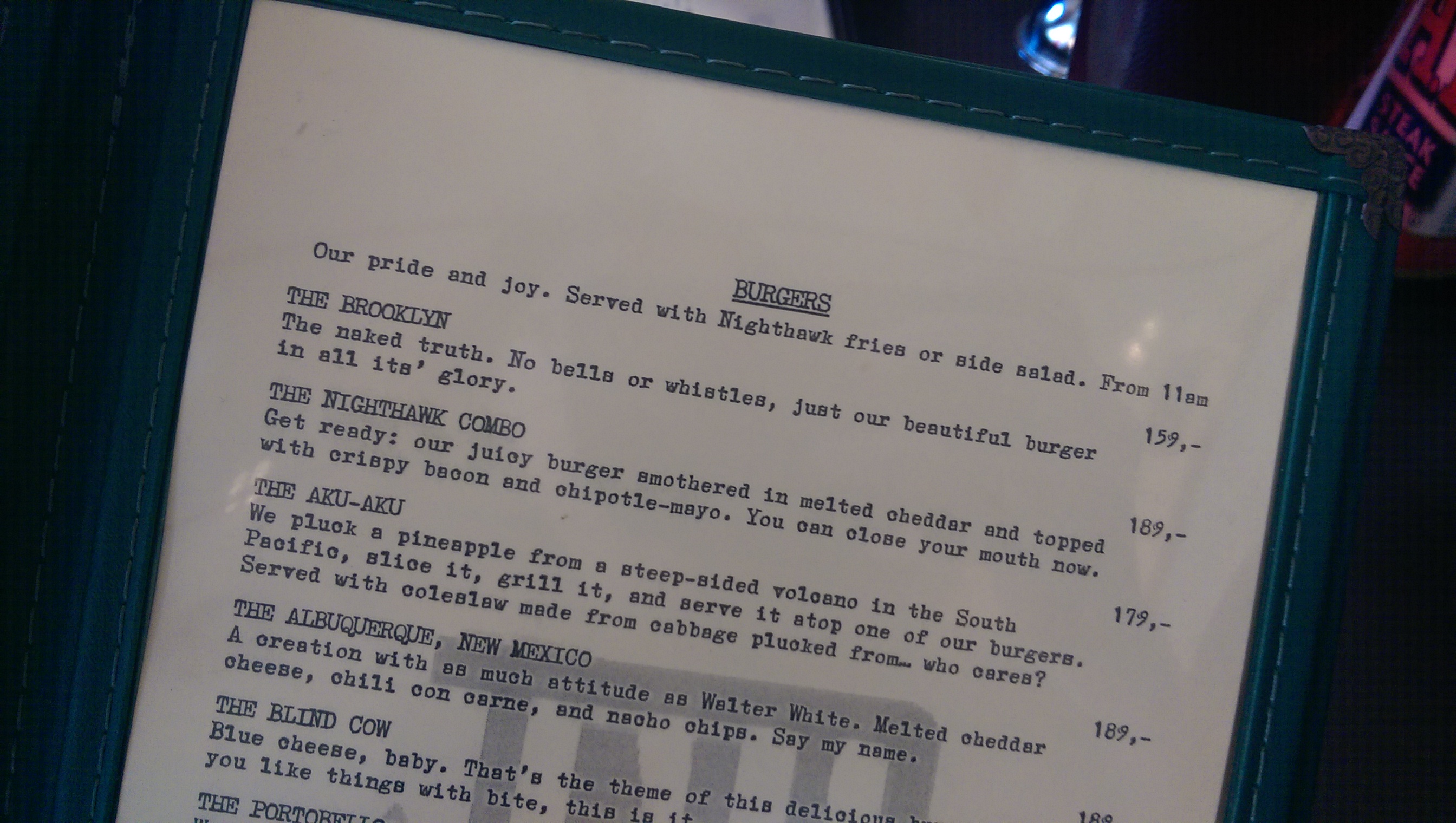 Prisene er ikke ille i det heletatt, det er mye å velge mellom. Vi valgte The Nighthawk Combo og The Portebello. Førsnevnte står beskrevet i bilde over. Og The Portobello hadde to store skiver portebello sopp og mozerella og en annen dressing. Burgerne var kjempe gode!