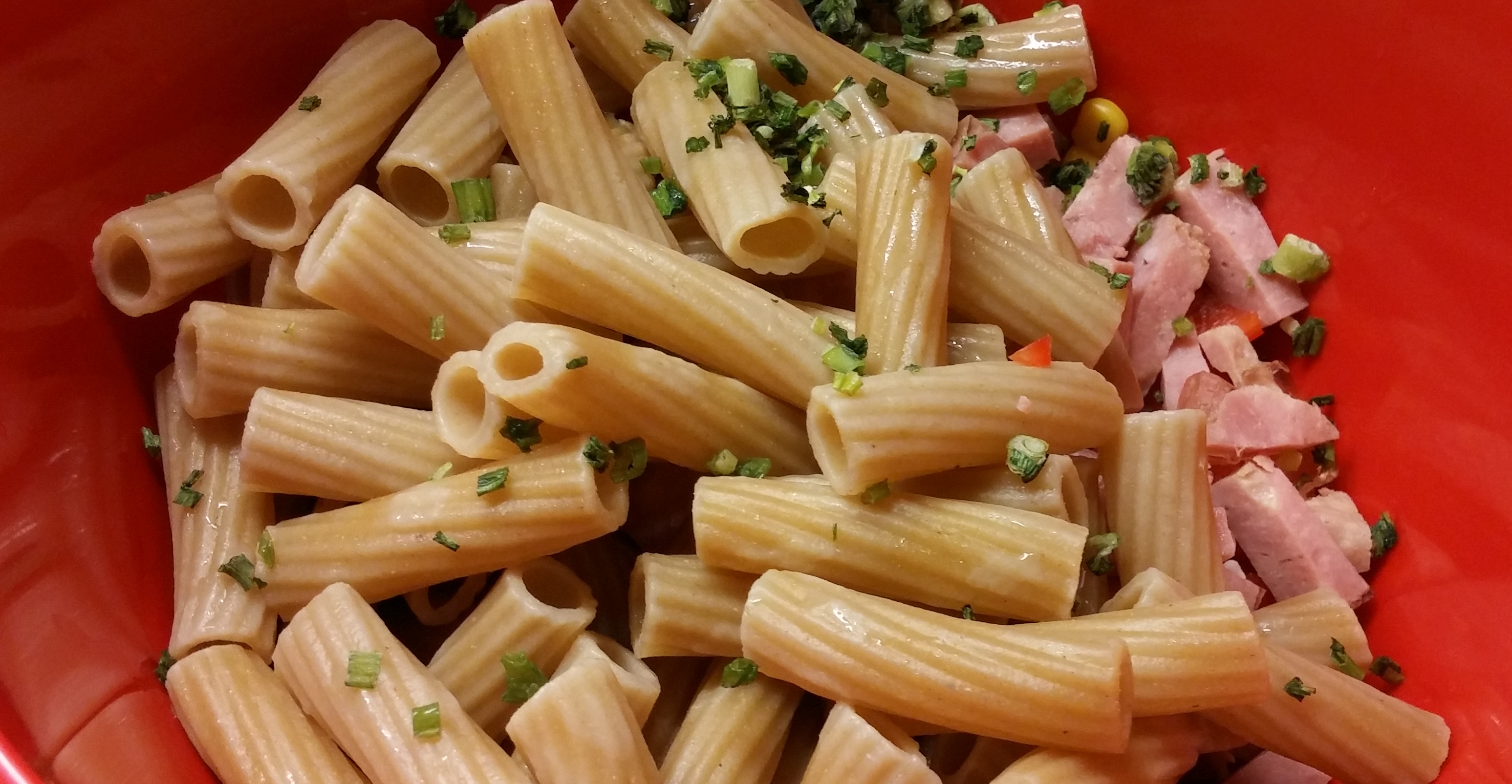 Deretter kutter du opp skinken og har oppi den kalde pastaen.