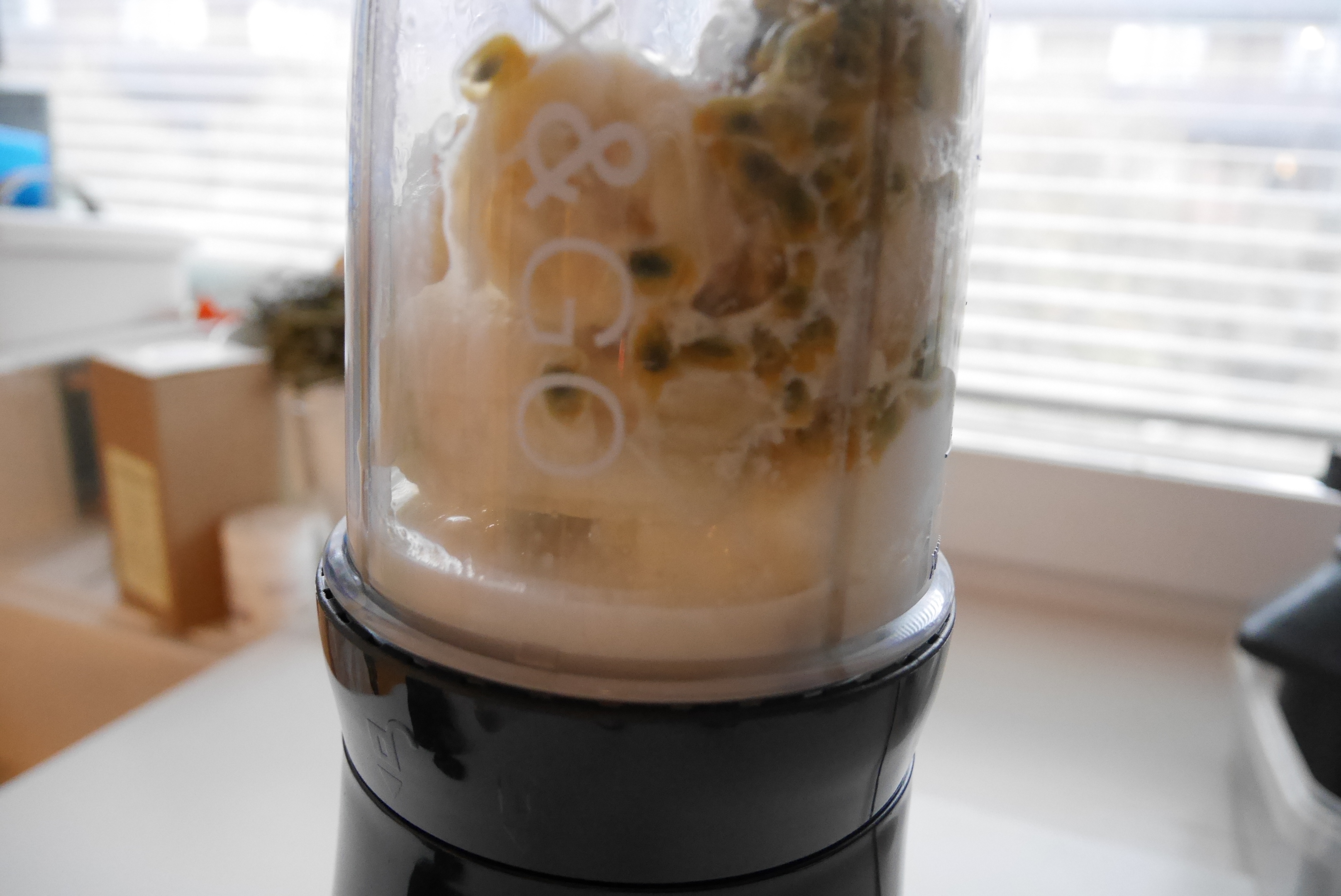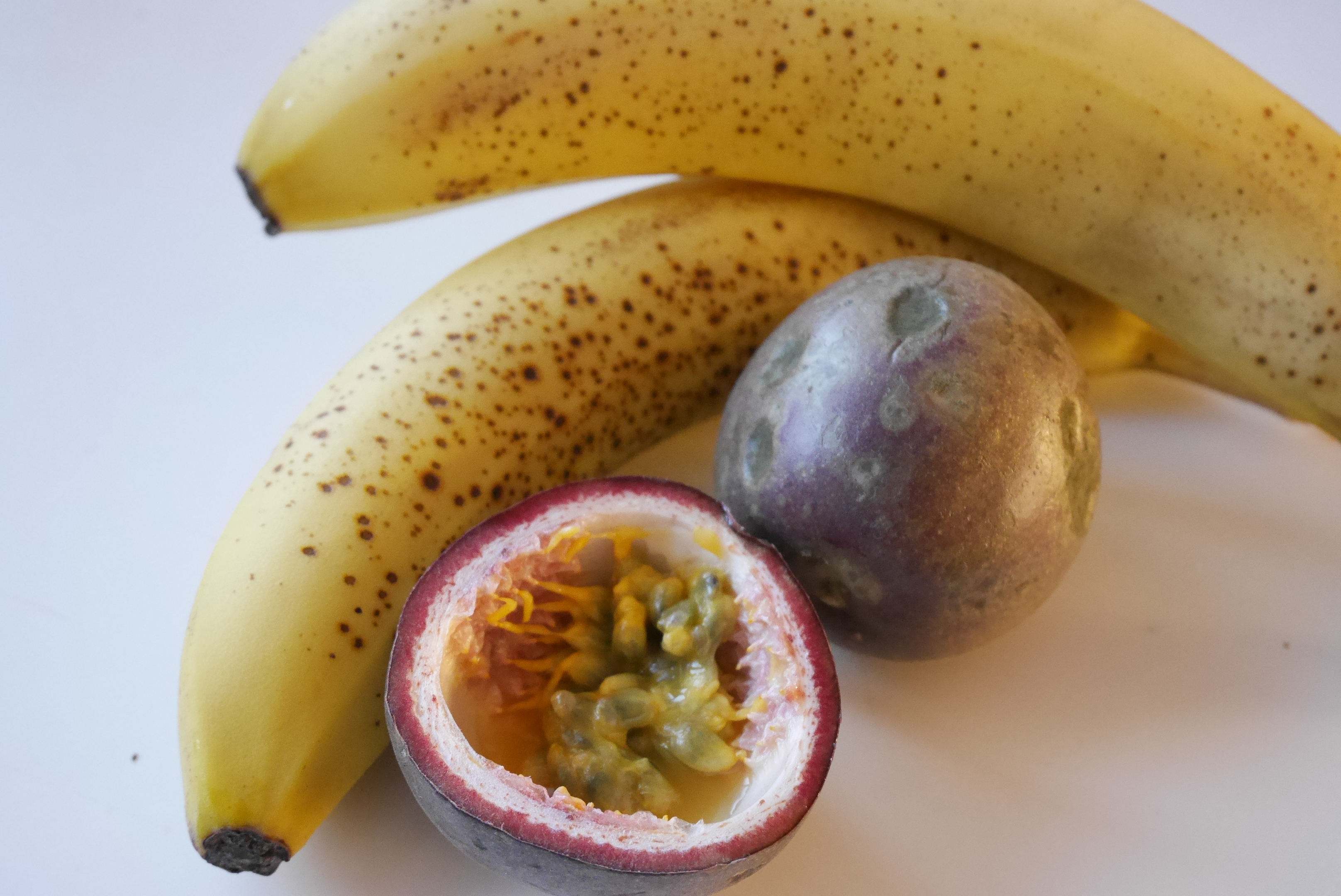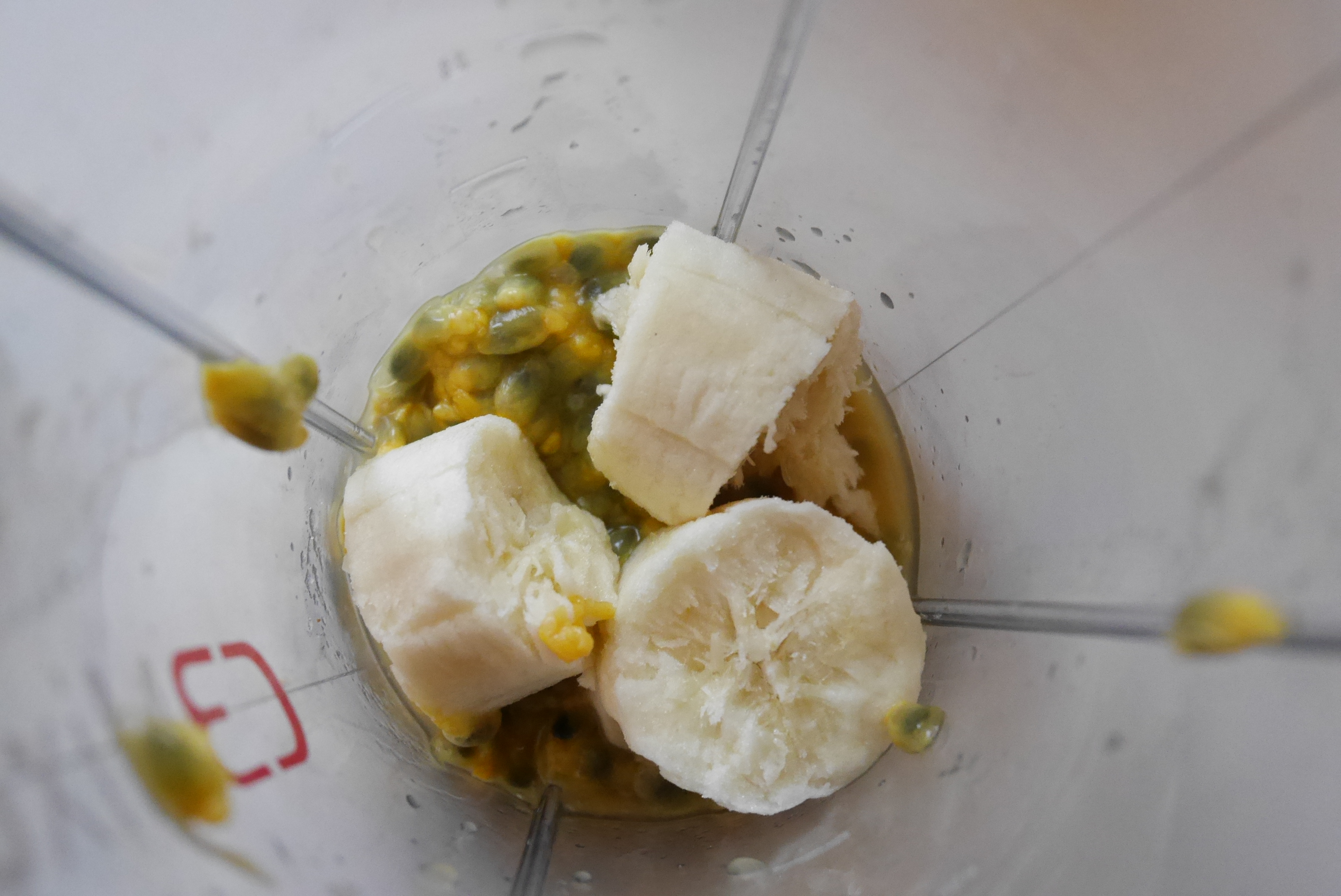 Del passjonsfrukten i to og skrap ut innholdet. Fjern skallet på bananen og del det opp –  ha dette oppi blendern