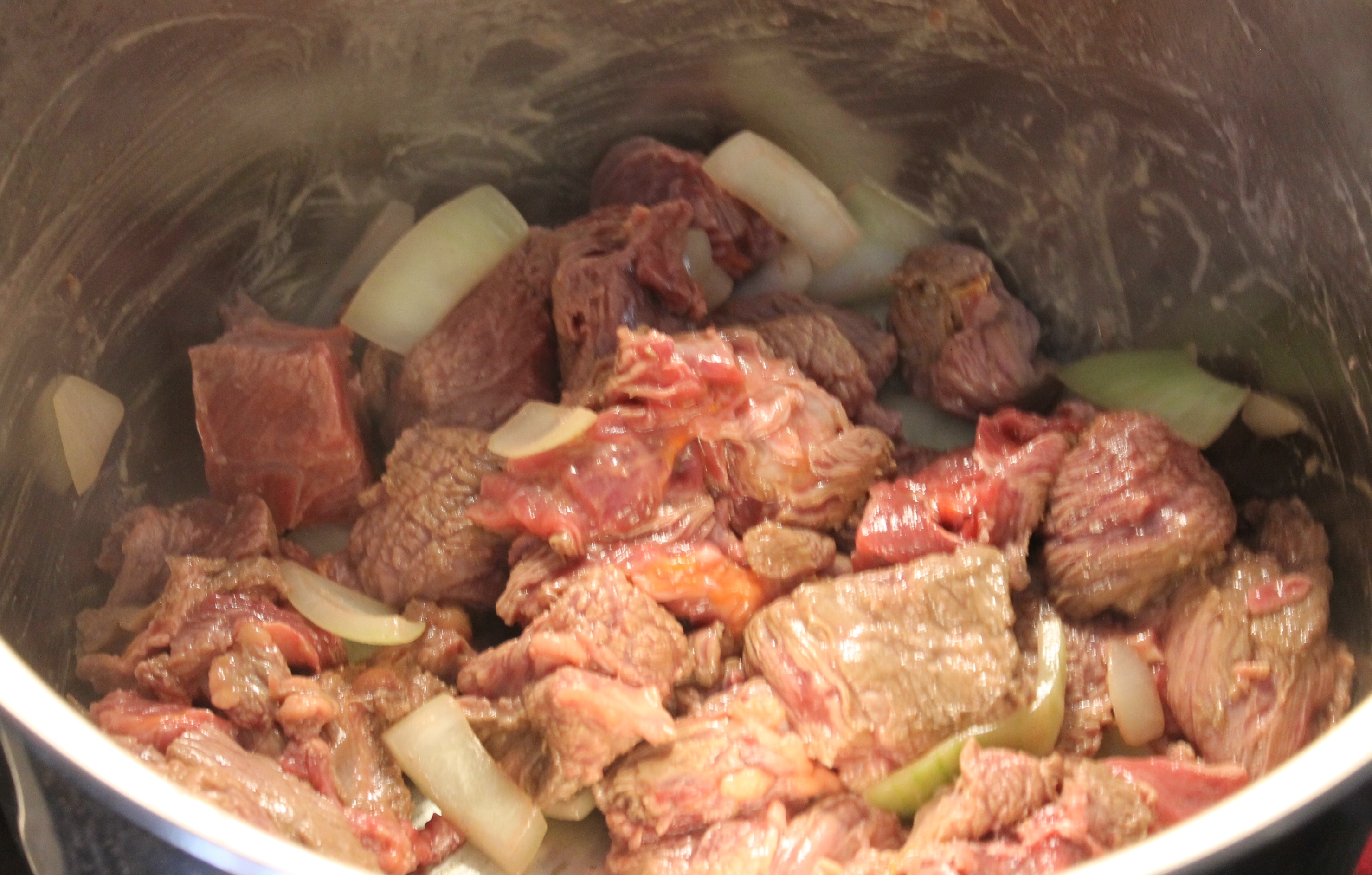 2.) Skrell hvitløken og hakk den opp. Ta en halv løk og finhakk den. Kjøttet kuttes opp i passe store biter. Ha litt olivenolje i en stekepanne, ha oppi hvitløken og løken oppi først. Deretter ha oppi kjøttet og brun det lett, salte lett. Når kjøttet er brunet opp ha dette oppi gryta.