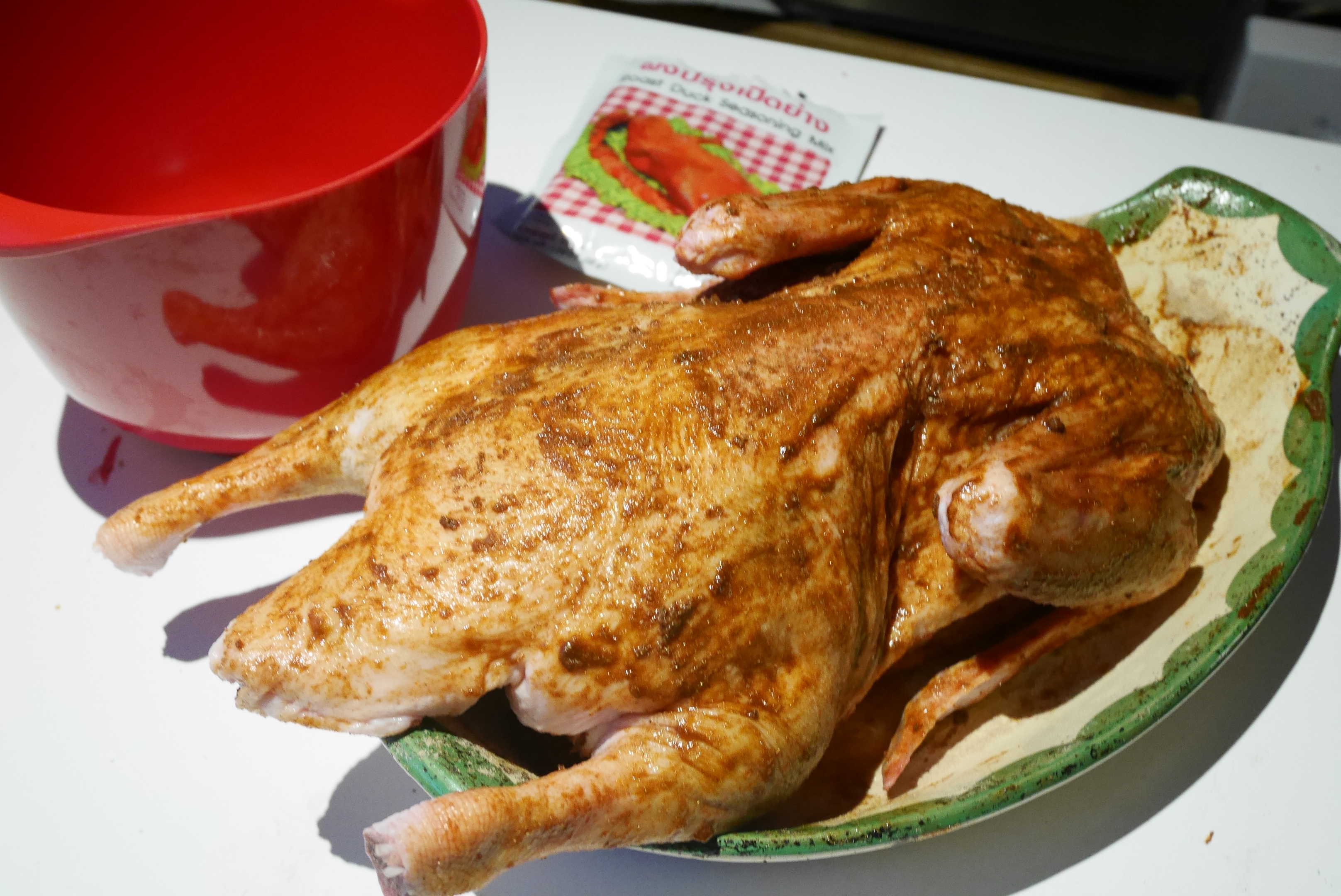 1. Tørk anden med torky eller papir som ikke loer. Når anden er tørket gni den inn med krydderet, hele anden skal dekkes godt. Dekk til med folie og la denne stå over natten for best smak.