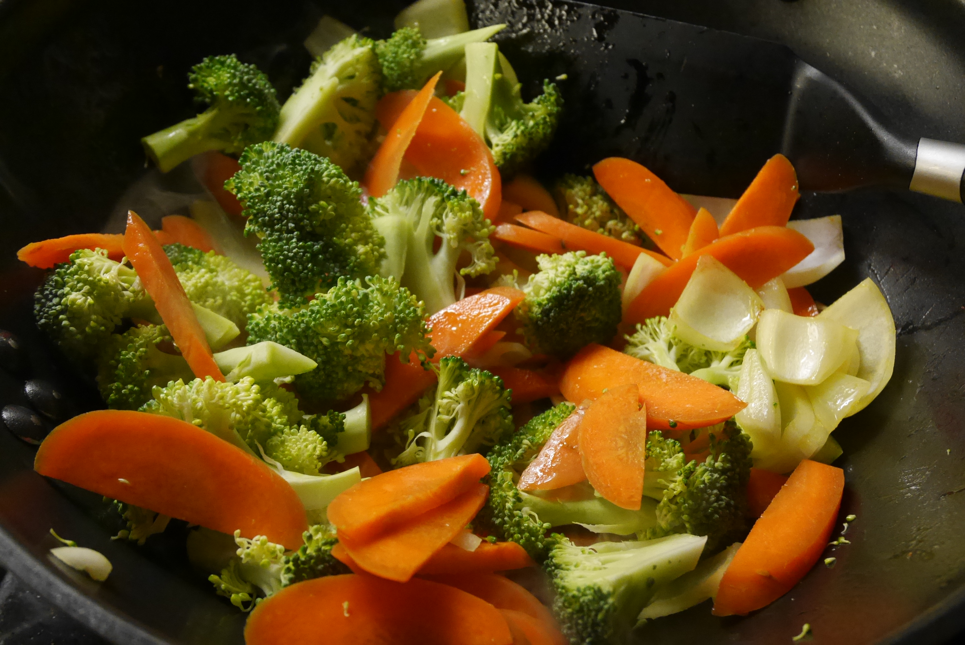 3. Hakk opp grønsakene i passe store biter og wok dem eller stek dem i en stor panne, og kok opp risen.