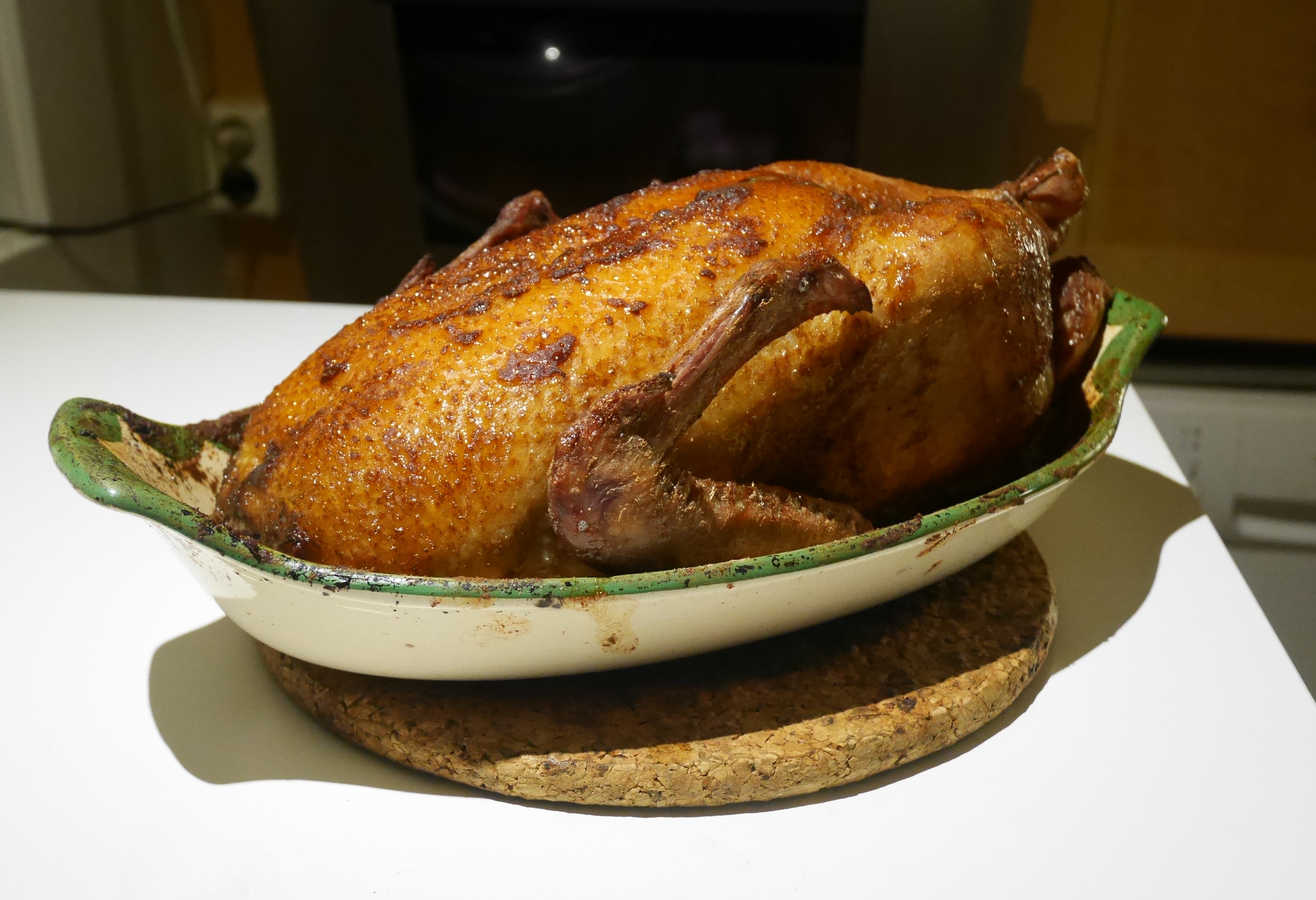 2. Stek anden midt i ovenen på 160 grader i ca 1 time eller til kjernetemperatur 68 grader.