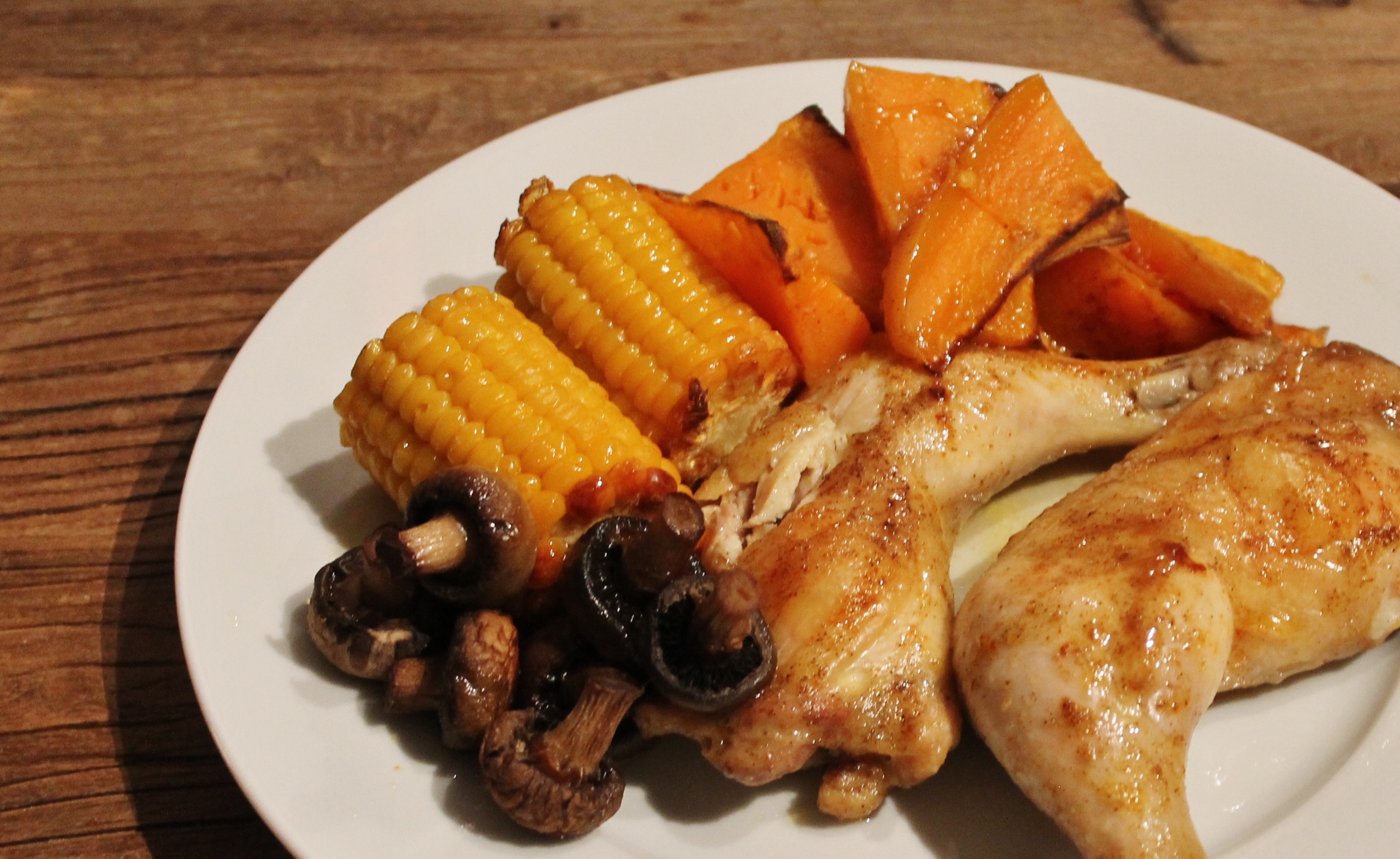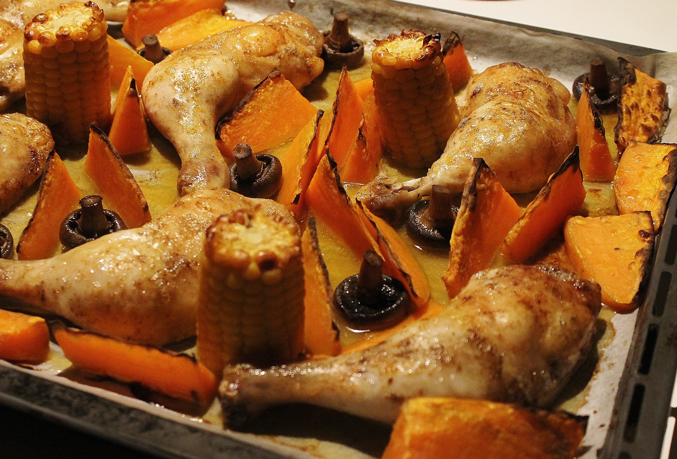Legg kyllinglårene på et stekebrett, Kutt opp maiskolbene i 3 (eller 2). Skrell søtpotetene og kutt dem opp i båter. Pensle disse med litt olivenolje og salte dem forsiktig. Spe disse rundt på stekebrettet, hvis det ikke er plass, så kan man steke disse på et eget brett (vi gjør oftest det da kyllinglåret gir fra seg en del væske).